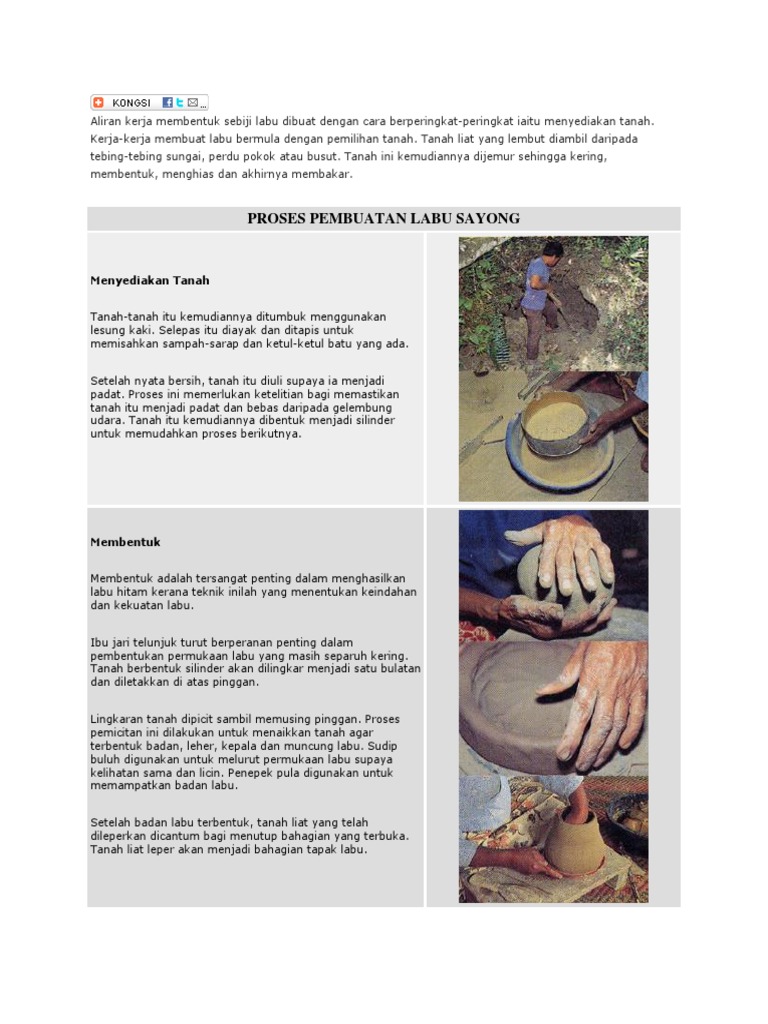 Jika sudah mendidih masukan labu dan jagung tunggu 5 menit lalu masukan kacang panjang dan pucuk labu lalu taburi gula garam dan penyedap rasa. Untuk tempahan labu sila layari WWWKOPERASI-LABU-SAYONGBLOGSPOTCOM atau datang ke Koperasi Kepala Bendang Sayong Kuala KangsarTel 016-5067400 isa rah. Proses pembakaran terbahagi kepada dua peringkat iaitu menyalai dan membakarProses menyalai tembikar dilakukan di atas para dengan bahan-bahan pembakaran selama lebih kurang enam.